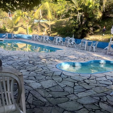 Área da piscina: 12 mesas quadradas guarda sol, 1 mesa redonda, 28 cadeiras